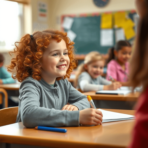Леворукая девочка с рыжими кудрями рисует левой рукой за партой, улыбаясь учителю