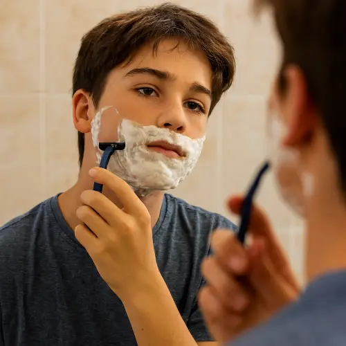 Подросток бреется перед зеркалом — этап полового созревания. Статья о первых поллюциях у мальчиков, гормональных изменениях и том, как родителям помочь подростку принять естественные процессы взросления.
